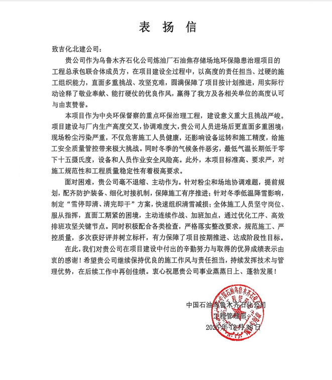 近日,中國(guó)石油烏魯木齊石化公司工程管理部向我公司發(fā)來(lái)表?yè)P(yáng)信,對(duì)第四分公司烏石化項(xiàng)目部在烏魯木齊石化公司煉油廠石油焦存儲(chǔ)場(chǎng)地環(huán)保隱患綜合治理項(xiàng)目建設(shè)中的突出表現(xiàn)給予高度評(píng)價(jià),充分肯定了北建公司敬業(yè)奉獻(xiàn)、能打硬仗的優(yōu)良作風(fēng)。