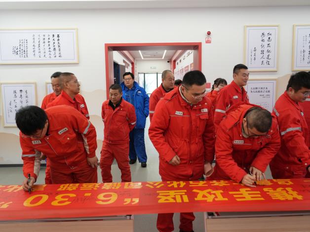 隨后,儲運部、吉林夢溪與第四分公司施工代表先后作表態(tài)發(fā)言,鄭重承諾將以最硬作風(fēng)、最強擔當,全力保障項目安全、質(zhì)量與進度。在張艷冰書記的帶領(lǐng)下,全體人員莊嚴宣誓:“保安全、保質(zhì)量、保工期,決戰(zhàn)決勝‘6?30’!”鏗鏘誓言回蕩在會場,彰顯了全體參建人員攻堅克難的堅定決心。最后,全體人員在主題橫幅上簽名承諾,并合影留念,定格下攜手攻堅的難忘瞬間。
